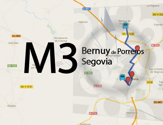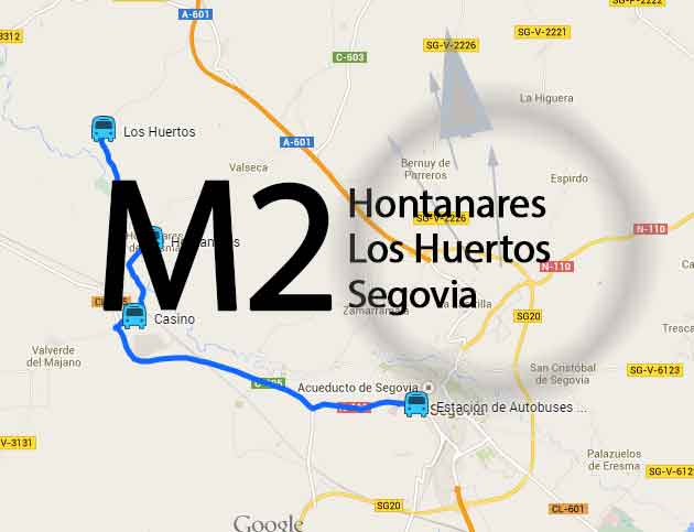 Línea Metropolitana M1. Segovia-Hontanares de Eresma-Los Huertos. De lunes a viernes (solo laborables), con salida de Segovia a las 9.00 horas y fin de servicio en Los Huertos a las 19.12. En el recorrido inverso, salida de Los Huertos a las 8.00 y fin de servicio en Segovia (estación de autobuses) a las 16.50. Efectúa parada en el Casino de la Unión (Valverde del Majano). Empresa: Linecar. 921445555. Observaciones: Servicio de las 19.00h (salida estación de autobuses) continúa recorrido hasta Valladolid. Imprimir Mapa...