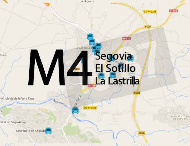 Línea Metropolitana M4. Segovia-La Lastrilla-El Sotillo. El servicio dispone de dos itinerarios, habitualmente Segovia-La Lastrilla y El Sotillo, y marcados con «*» Segovia-El Sotillo-La Lastrilla, ambos con idénticas paradas. Horario laborables de 7.15h a 22.08. Sin servicio domingos y festivos, horario especial sábados laborables. Empresa: Linecar. 921445555. Imprimir Mapa...