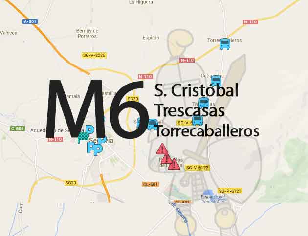 Línea Metropolitana M6. De Segovia a Torrecaballeros. Con salida en Segovia a las 07.25 y fin de servicio en Torrecaballeros a las 21.50. Efectúa paradas en recorrido urbano y San Cristóbal de Segovia, Sonsoto, Trescasas, Cabanillas y Torrecaballeros (paradas en Palazuelos y Tabanera del Monte en el servicio de las 21.20). En recorrido inverso inicia el servicio en Torrecaballeros a las 7.00 y finaliza a las 22.05 en Segovia (efectúa paradas en Palazuelos y Tabanera a las 21.37 y 21.35). Laborables de lunes a viernes. Empresa: Linecar. 921445555. Última...