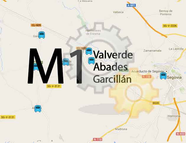 Línea Metropolitana M1. Segovia-Polígono Nicomedes García – Casino – Valverde del Majano – Abades – Martín Miguel – Garcillán. Laborables de lunes a vieernes: primera salida desde Segova a las 06.40 (parada única Polígono) y fin del servicio Segovia 21.35. Recorrido inverso: Garcillán 07.10 y fin de servicio Segovia 21:35 . Realiza servicio restringido sábados laborables, Empresa: Linecar. 921445555. Imprimir Mapa...