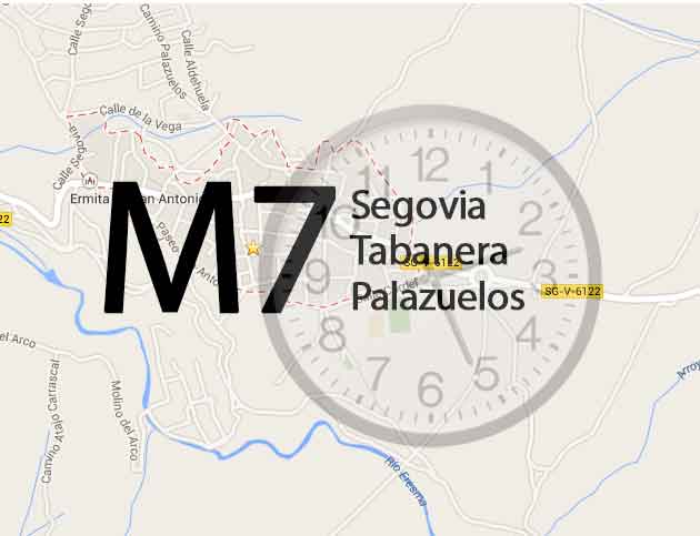 Línea Metropolitana M7. Segovia-Palazuelos-Segovia. Paradas en Tabanera del Monte. Horario laborables de 7.15h a 22.05. Extensión del servicio los sábados, domingos y festivos: San Cristóbal, Sonsoto, Trescasas, Cabanillas, Torrrecaballeros. Empresa: Linecar. 921445555. Actualizado febrero 2019. Especial: enlace Segovia Guiomar – Estación AVE Imprimir Mapa...